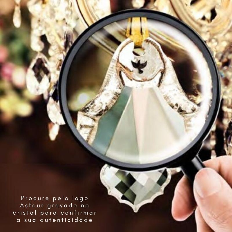 A durabilidade e qualidade do brilho dos cristais Asfour têm garantia vitalícia. A autenticidade do Cristal Asfour é comprovada pelo logo gravado no topo do cristal.