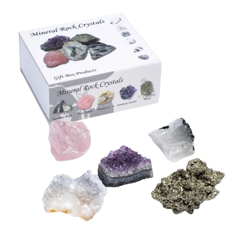Este conjunto é composto por 5 cristais em bruto, ou seja, na sua forma natural e acompanha uma caixa de cartão branco.